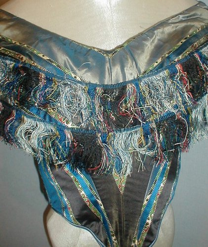 A magnificent and elaborate 1860’s Civil War era stripe multi colored satin evening bodice that has recently been de-accessioned from a museum collection. The cataloging number is written inside the bodice. The fabric has a changeable quality depending on light reflection. The stripes are done in shads of steel blue, black and royal blue and are intermingled with a white stripe. The white stripe has a red, green and black pattern. The bodice has a Bertha style collar that is trimmed with two rows of multi colored silk fringe. The bodice has short puffed sleeves. It is lined with cotton and the lining has two padded bust enhancements. The round neckline, armscyes and waist are piped. The bodice has a back lacing closure but the lacing is missing. It is in very good and sturdy condition. There are no splits or holes and just very light underarm discoloration on the inside lining only. Bust 32 Waist 26.